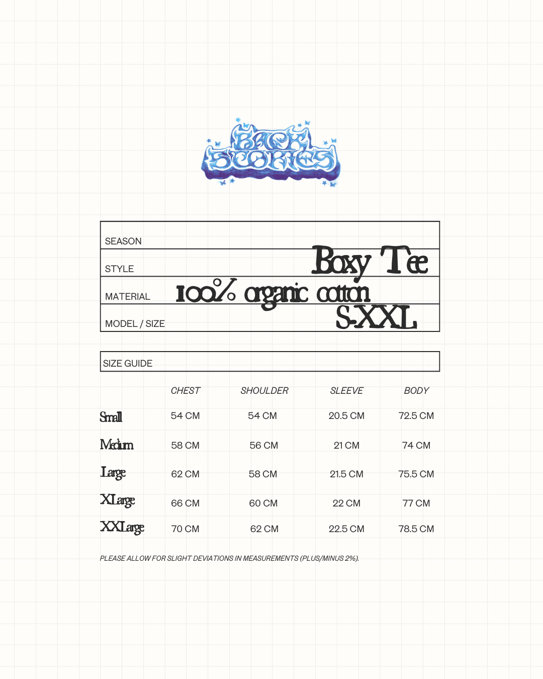 Heavyweight, 100% organic cotton—because flimsy tees are not the vibe. Oversized and boxy for that effortlessly cool fit, featuring a chunky crewneck rib that holds its shape (no sad, floppy collars here). Finished with clean stitching, felled shoulder seams, and neck tape for extra durability.